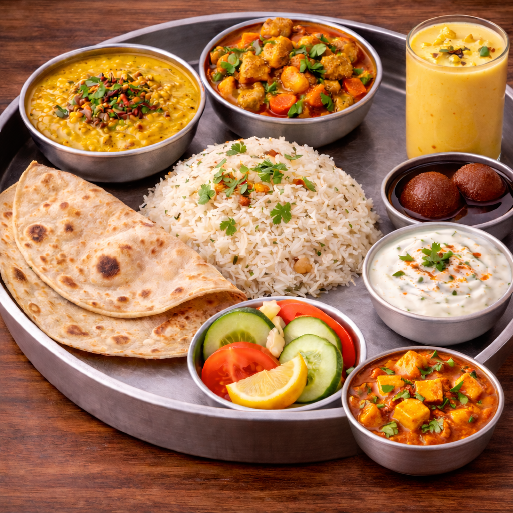 Daal Fry (8 oz) , Aloo matar soya Vadi (Nutrela) (8 oz) , Paneer Tikka Masala (8 oz) , Tawa Roti (2 pcs) , Rice (8 oz) , Mango Lassi , Salad , Raita , Gulab Jamun