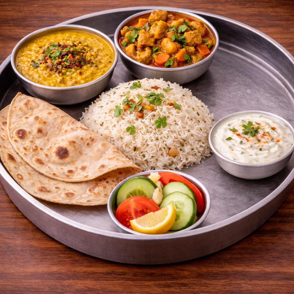 Daal Fry (8 oz) , Aloo matar soya Vadi (Nutrela) (8 oz) , Tawa Roti (2 pcs) , Rice (8 oz) , Salad , Raita