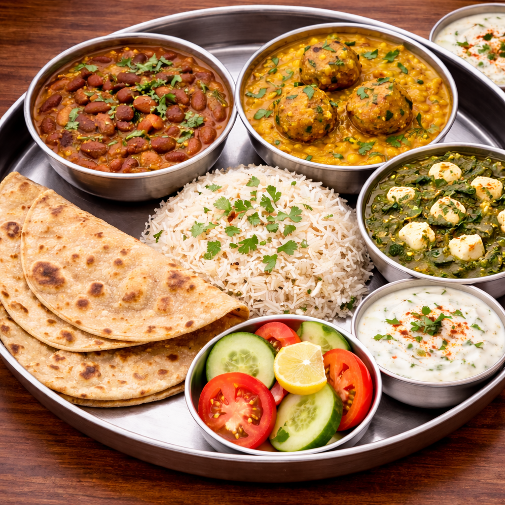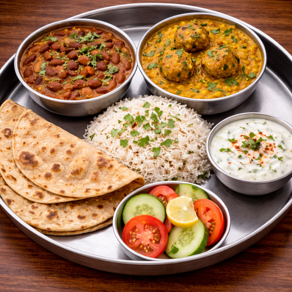 Rasamisse Rajma (8 oz) , Chana Daal veggie Kofta curry (8 oz) , Tawa Roti (2 pcs) , Rice (8 oz) , Salad , Raita