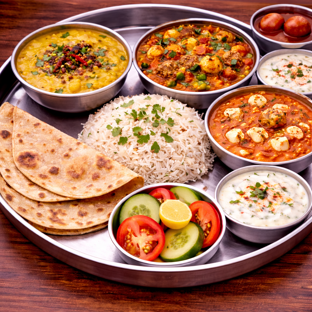 Daal Tadka (8 oz) , Kohlapuri Mix Veg (8 oz) , Paneer Butter Masala (8 oz) , Tawa Roti (2 pcs) , Rice (8 oz) , Salad , Raita , Dessert