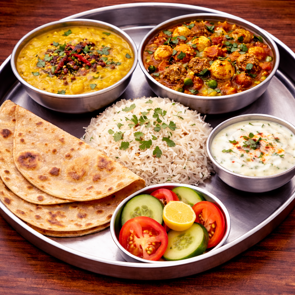Daal Tadka (8 oz) , Kohlapuri Mix Veg (8 oz) , Tawa Roti (2 pcs) , Rice (8 oz) , Salad , Raita (4 oz)